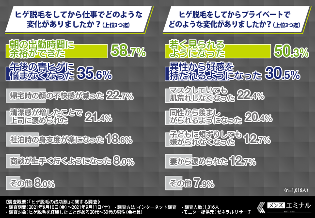 ヒゲ脱毛をした男性の3割以上が「異性から好感を持たれるようになった」と感じていることが、以下のアンケート調査の結果からわかります。